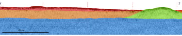 On the IC BS2 track, it is a north-south track, this track is the track closest to the pioneer pier. There is a seabed feature in the form of a height at coordinates X: 456495 m, Y: 181561 m, this height extends to the IC BS3 track about 50 meters. This feature is a sand bar that is formed parallel to the coastline, the sand bar is a characteristic of the depositional environment where the influence of waves is more dominant than the tidal process. In areas like this, the tidal process only raises and lowers the water level. After the bar is formed, some fine material can be deposited behind the bar towards the land. The reflection pattern of the layer near the seabed shows a parallel but discontinuous reflection pattern which is interpreted as a layer of fine sandy silt.