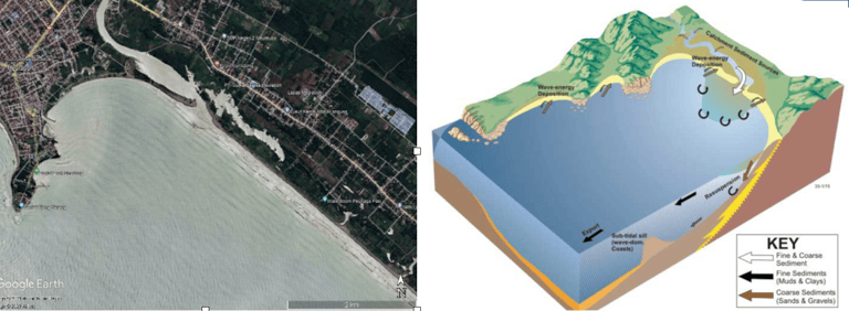 Figure 1. Comparison of the physiographic conditions of Meulaboh (taken from Google Earth imagery in 2023) with the conceptual embayment model