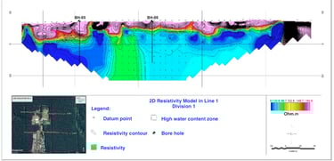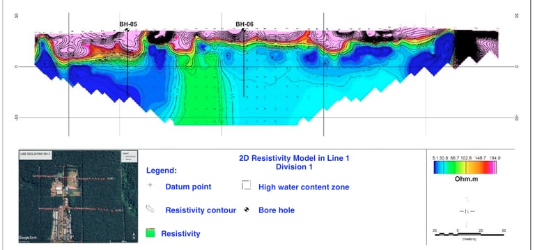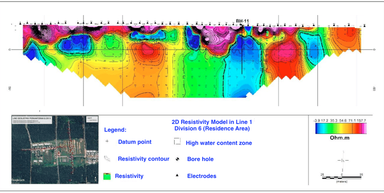 The soil or rock resistivity value recorded along a 500-meter and a depth of up to 90 meters has a range of values of around 0 to 1000 ohm.m, but the average maximum value at each point is still below 500 ohm.m. The water content in the soil that correlates with the resistivity value is below the range of 100 ohm.m but in the calculation of reserves only the range value of around 0 to 30 ohm.m is used.