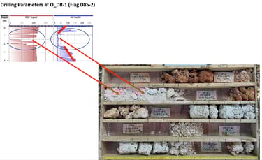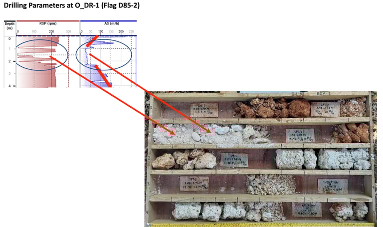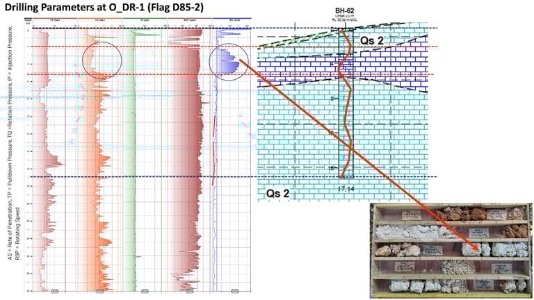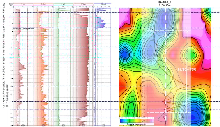 Diagraphy drilling continuously records five (5) parameters during the drilling process. The results indicate no voids or cavities up to a depth of 30 meters at several locations.