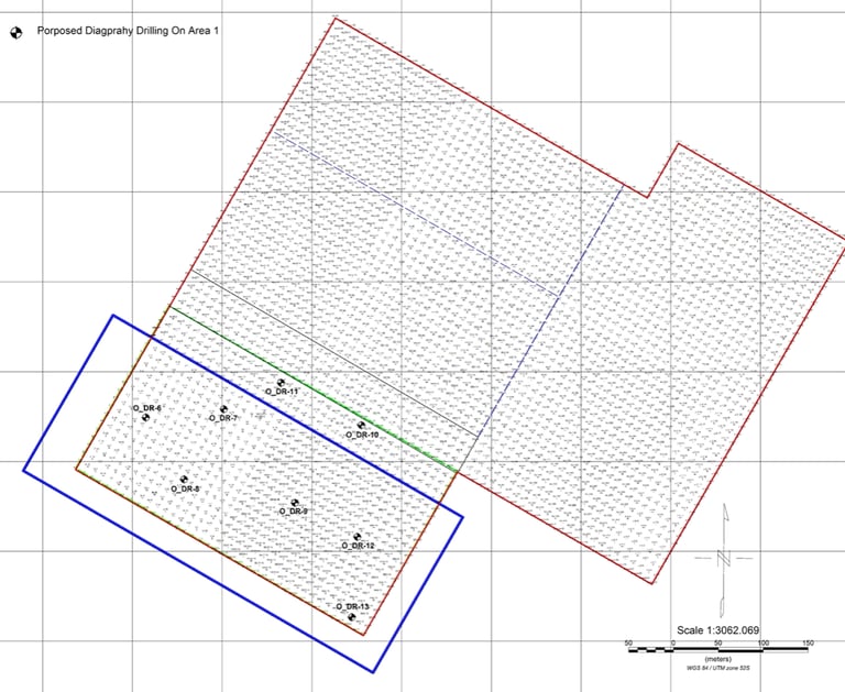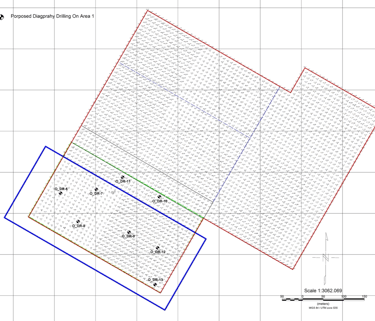 Figure 1. Microgravity survey area and proposed diagraphy drilling on area 1 (marked with the blue reactangle).